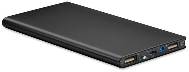 Újrahasznosított alumínium külső akkumulátor. 8000 mAh. Okostelefonok töltéséhez. Kimeneti adat: DC5V/1A és DC5V/2A. Jelzőfénnyel és mikro USB kábellel.
