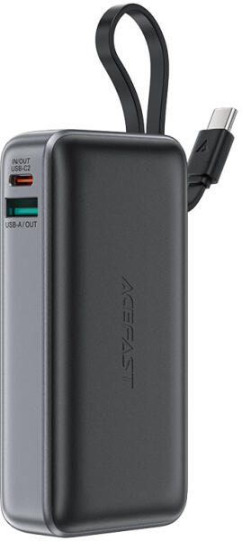 ACEFAST M7-10000 Powerbank 1xUSB-A És 1xUSB-C Csatlakozással Beépített Type-C Kábellel 10000 mAh 30W PD-Fekete