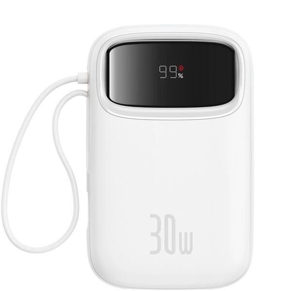 Baseus QPow 2 30W 10000mAh Power Bank beépített USB-C kábelekkel - Fehér színben A Baseus QPow 2 egy innovatív power bank, amely egyesíti a nagy, 10 000 mAh-s kapacitást, a fejlett gyorstöltési technológiákat és a kompakt kialakítást. Többféle töltési protokoll, például a PD3.0, QC3.0, SCP és AFC támogatásával azonnali energia-visszatöltést biztosít eszközei számára. A beépített USB-C kábelek és a további portok lehetővé teszik akár négy eszköz egyidejű töltését is, így rendkívül sokoldalúan használható. Védelmi funkciókkal, például túlfeszültség- és túlmelegedés elleni védelemmel felszerelve biztonságos és megbízható. Kompakt mérete, mindössze 236 g-os súlya és kényelmes pántja tökéletes útitárssá teszi. Válassza a Baseus QPow 2-t, és élvezze a kényelmet és a hatékonyságot minden helyzetben! Specifikáció: