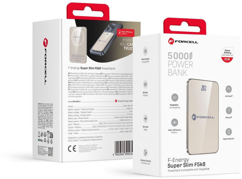 Az F-Energy Super Slim F5k8 egy modern külső akkumulátor, amelyet olyan eszközök felhasználói számára terveztek, mint az iPhone, Apple Watch és AirPods. Kivételesen vékony, könnyen tárolható és szállítható, és masszív konstrukciója jellemzi – tartós anyagokból, például edzett üvegből és alumíniumból készült. Támogatja a gyorstöltési technológiát is.