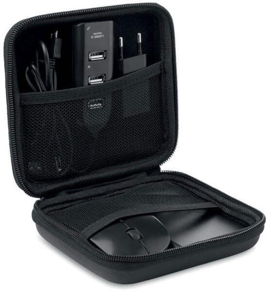 Számítógépes kiegészítő szett EVA/PU tokban: 1 vezeték nélküli egér, 4 portos 2.0 USB csatlakozó, 1 EU-s csatlakozó és egy 4000 mAh külső akkumulátor. Mikro USB kábellel a töltéshez.