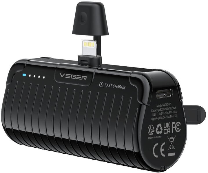 VEGER powerbank 5000 mAh beépített csatlakozókkal Lightning PlugOn PD QC3.0 3A 20W W0558P, fekete